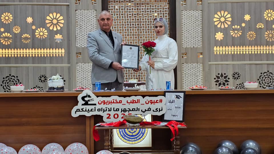 اقام قسم تقنيات المختبرات الطبية في المعهد التقني المسيب حفل تخرج لطلبة الدراسة المسائية لطلبة قسم تقنيات المختبرات الطبية بحضور الاستاذ المساعد الدكتور مالك نعمة حواس الخزرجي عميد المعهد التقني المسيب والأستاذ المساعد قاسم علي عمران المعاون الاداري ورئيس القسم الدكتور علي ظاهر ومقررة القسم الدكتورة ازهار موسى وعدد من المنتسبين والطلبة حيث بدأ الحفل بتلاوة اي من الذكر الحكيم ومن ثم الاستماع للنشيد الوطني وقوفا ومن ثم القاء كلمة العمادة من قبل الدكتور الخزرجي مرحبا بالطلبة الاعزاء ومقدما التهاني للطلبة بمناسبة تخرجهم وخاصة انهم الدفعة الاولى لتخرج الدراسة المسائية في المعهد متمنيا لهم الموفقية في حياتهم ما بعد التخرج وتناول الحفل القاء قسم التخرج من قبل مقررة القسم الدكتورة ازهار موسى وكذلك توزيع شهادات التخرج من قبل الاستاذ المساعد الدكتور مالك نعمة حواس الخزرجي عميد المعهد التقني المسيب والسادة المعاونين ورئيس قسم تقنيات المختبرات الطبية ورئيس قسم تقنيات الاجهزة الطبية وفي ختام الحفل تم التقاط الصور التذكارية بهذه المناسبة.